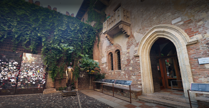 Добрая половина туристов идет в первую очередь во Дворик Джульетты. Романтическая слава героев Шекспира не обойдет стороной даже тех, кто скептически относится к таким достопримечательностям. Поэтому сюда стоит зайти, хотя бы за тем, чтобы избавиться от иллюзий. Это здание когда-то принадлежало роду Даль Капелло, но в 1907 году муниципалитет выкупил его у обнищавших родственников главной героини шекспировской трагедии, превратив в главную приманку для туристов. Сюда приходят постоять в толпе людей, стремящихся сфотографироваться со статуей Джульетты, чья грудь гладко отполирована мужскими руками. Считается, что это приносит удачу в любовных делах. Мужчины под балконом ждут, когда же очередь дойдет до их Джульетты. А дамам любопытно зайти в дом Джульетты и увидеть убранство комнат, царившее в конце шестнадцатого века. Повесить замочек-сердечко или оставить любовное послание на специальных съемных панелях в арке. Хотя еще пару лет назад их писали на стенах, лепили жвачки с посланиями, за что сейчас берут солидные штрафы.