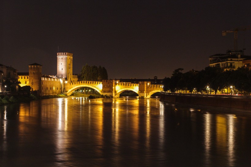 Отойдя всего пару кварталов от Арены, попадаем в средневековье. Его символ – замок Кастельвеккио, построенный династией Скалигеров, правившей Вероной в 14-15 веках. К замку примыкает знаменитый мост Скалигеров, с каменными «ласточкиными» зубцами. В замке Кастельвеккио сейчас находится музей с богатой коллекцией средневековой скульптуры и живописи. Особенно красиво смотрится мост Скалигеров ночью – подсветка делает сооружение невесомым, и стены отражаются в водах реки.