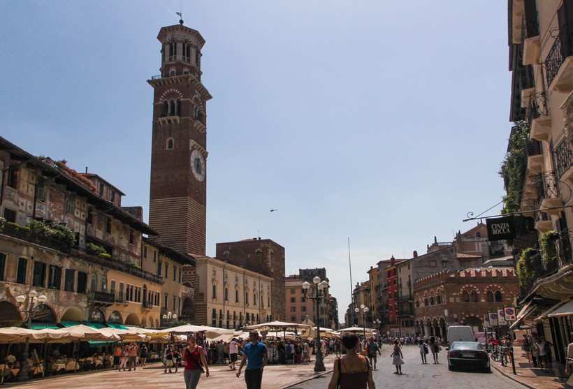 Эпоха Скалигеров оставила яркий след не только в архитектуре, но и в развитии живописи, литературы, образования Вероны. Великий Данте жил здесь и писал в тот период. Памятник знаменитому поэту находится напротив от Арок Скалигеров, недалеко от Пьяцца делле Эрбе – Площади трав. Эта площадь расположилась на месте античного форума, а теперь стала местом паломничества туристов. Кроме рынка сувениров, здесь настоящее смешение разных пластов времен, отразившееся на внешнем облике площади. В ее северной части сохранились останки древнеримских стен. Семья Скалигеров оставила средневековый отпечаток, построив Дом Купцов и Башню дель Гарделло (часовая башня). Венецианская эпоха установила колонну, увенчанную статуей льва – святого Марка. А над всем этим великолепием возвышается башня Ламберти – самое высокое здание Вероны, с колоколами: «Ренго», который возвещал о заседаниях городского совета и призывал на войну, и «Марангона», предупреждавшем о пожарах городских жителей. На башне Ламберти находится смотровая площадка, с нее город виден как на ладони.