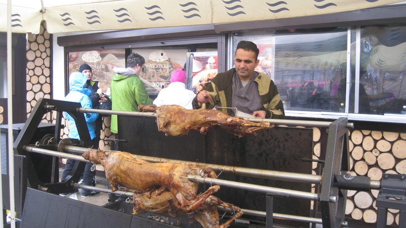Снежок здесь был местами желтоватый, это прилетевшие пески из Африки, а местами и вовсе отсутствовал. Но отсутствие снега, мелкий дождь не мешали людям веселиться. Музыка на полную катушку. Веселье полным ходом. Анимация, кафе, магазины. Вообще здесь есть все, чтобы провести весело время.