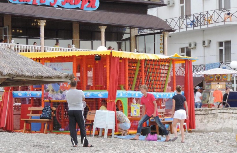 Не забыли здесь и о детях. На пляже стоят батуты, качельки, прыгунки, игровые центры. Если вам, например, захочется пройтись по поселку, но без ребенка, то вы можете оставить его в этом центре, час стоит 150 рублей, а вот весь день 300 — большая разница, не так ли?
