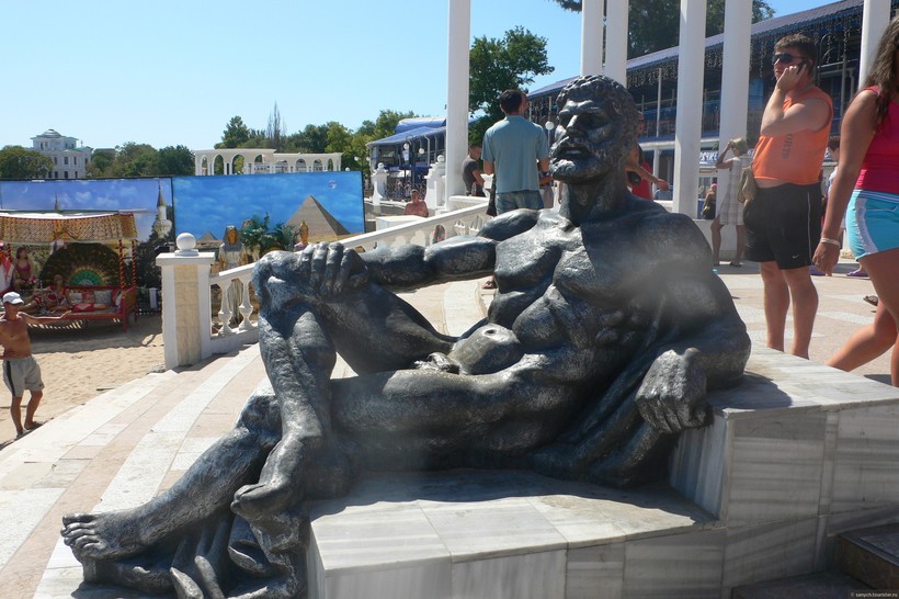 На пляже, также безмятежно прогуливаясь по нему, я обнаружила скульптуру знаменитому Ихтиандру (кто читал или смотрел "Человека-Амфибию", тот в курсе). Около статуи вечно толпится огромное количество народа, его наглаживают, фотографируются, загадывают желания. людей было так много, что мне даже сфоткаться с человеком-рыбкой не удалось. А ждать мне было лень.