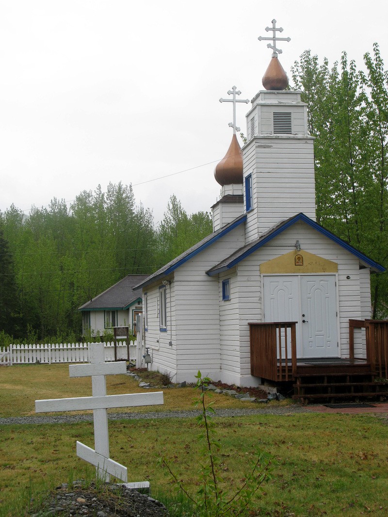 Денали. По расстоянию около 400 км от Анкориджа, но так как по пути делали 2 остановки, приехали только к вечеру уже. Первая остановка по пути в парк это поселок Эклутна. Аляска принадлежала раньше России, поэтому здесь остались памятные места. В этом поселке находится русская церковь Святого Николая 1870 года и православное кладбище, которое называют кладбище приведений. Кладбище интересно тем, что на могилах стоят то ли домики, то ли гробы, и выглядит это интересно, в России я таких захоронений никогда не встречала. Лично я думаю, что если ты русский, посетить это место надо обязательно, потому что это знакомство с историей России. Конечно сама церковь очень невзрачная, и в России есть более шикарные церкви.