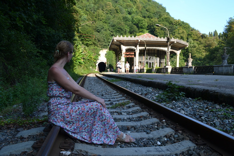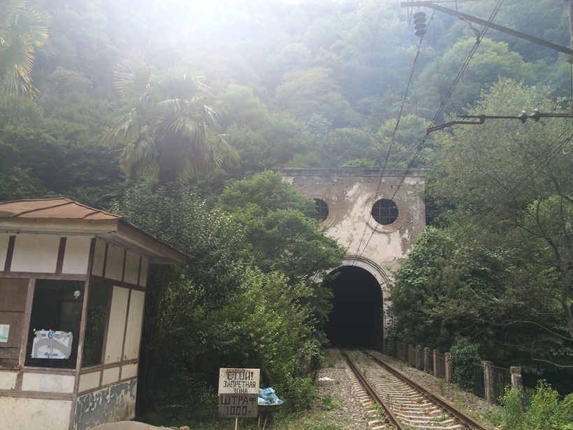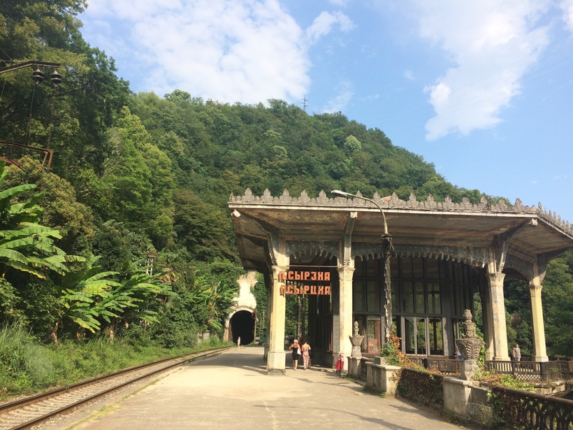 Дальше идет заброшенная железнодорожная станция Псырцха, расположенная над рекой с аналогичным названием и двумя тоннелями. Выглядит жутко и интересно.