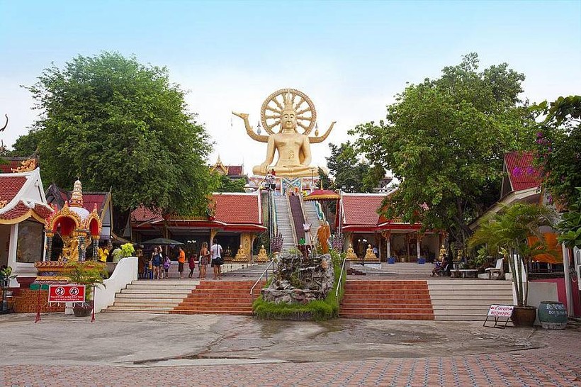 Пролетая на самолете над Самуи, я увидела очень большое здание с красивой красной крышей, это был Ват Плай Лаем. Уже тогда он привлек мое внимание.