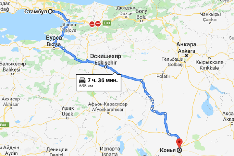 Стамбул — Конья — маршрут на карте