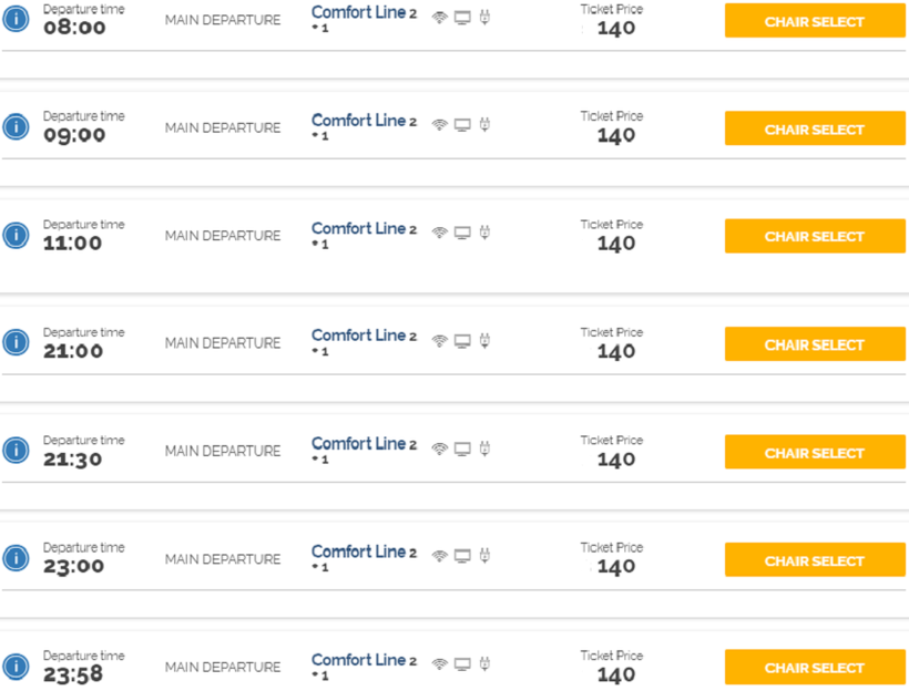 Учитывая длительное время в пути, советую выбирать ночной рейс. Если вы решите ехать днем, следует знать, что автобусы обеих компаний комфортабельные, с бесплатным интернетом и розетками — в дороге будет не скучно.