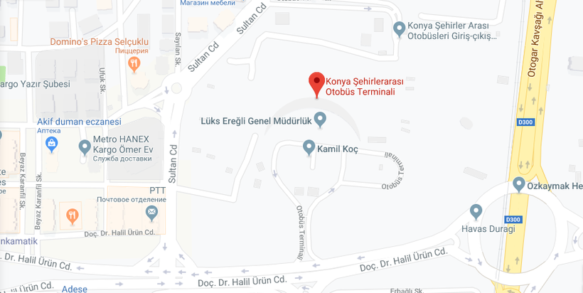 Путь до Коньи автобусы в среднем преодолевают за 10–10,5 часов, прибывают они на автовокзал Konya Şehirlerarası Otobüs Terminali на улицу Yazır Mahallesi.