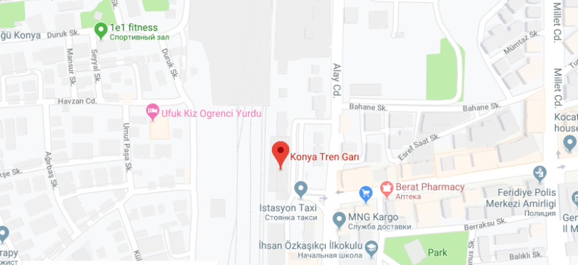 Путь из Стамбула в Конью поезд преодолевает всего за 5,5 часов, а прибывает он в Конью на ж/д станцию Konya tren gari на Ferit Paşa Cd.