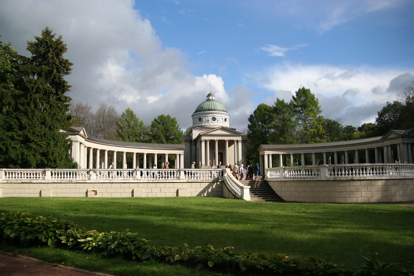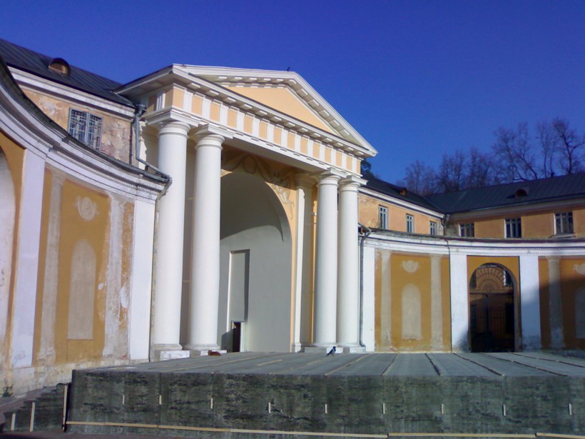 Прохожу параллельно реке левее и взору предстает самое необычное сооружение усадьбы - Колоннада (жена последнего владельца из Юсуповых задумала построить ее как семейную усыпальницу, но здание никогда в таком роде не использовалось) с храмом в центре. Нигде прежде я не видела такого необычного архитектурного замысла. Справа и вглубь парка находятся различные хозяйственные постройки (конторская, кладовая, гостевой дом и богадельня).