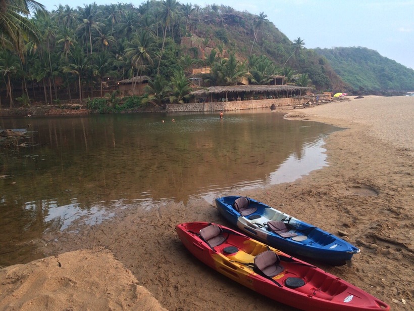 - Кола – мы встречали здесь 8 марта, более романтичного места на Гоа я не встречала. В небольшой бухте песчаный пляж окаймлен скалами, здесь располагаются два отеля. Они предлагают путешественникам обрести кров на любое время в бунгало (со всеми удобствами, между прочим и выходом прямо к океану). К услугам туристов прокат каноэ, ресторан при отеле с вполне адекватными ценами, встреча работником отеля (иногда такси не знает, как подъехать к отелю).