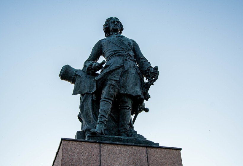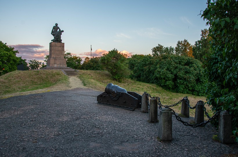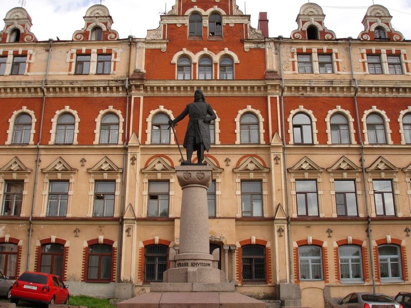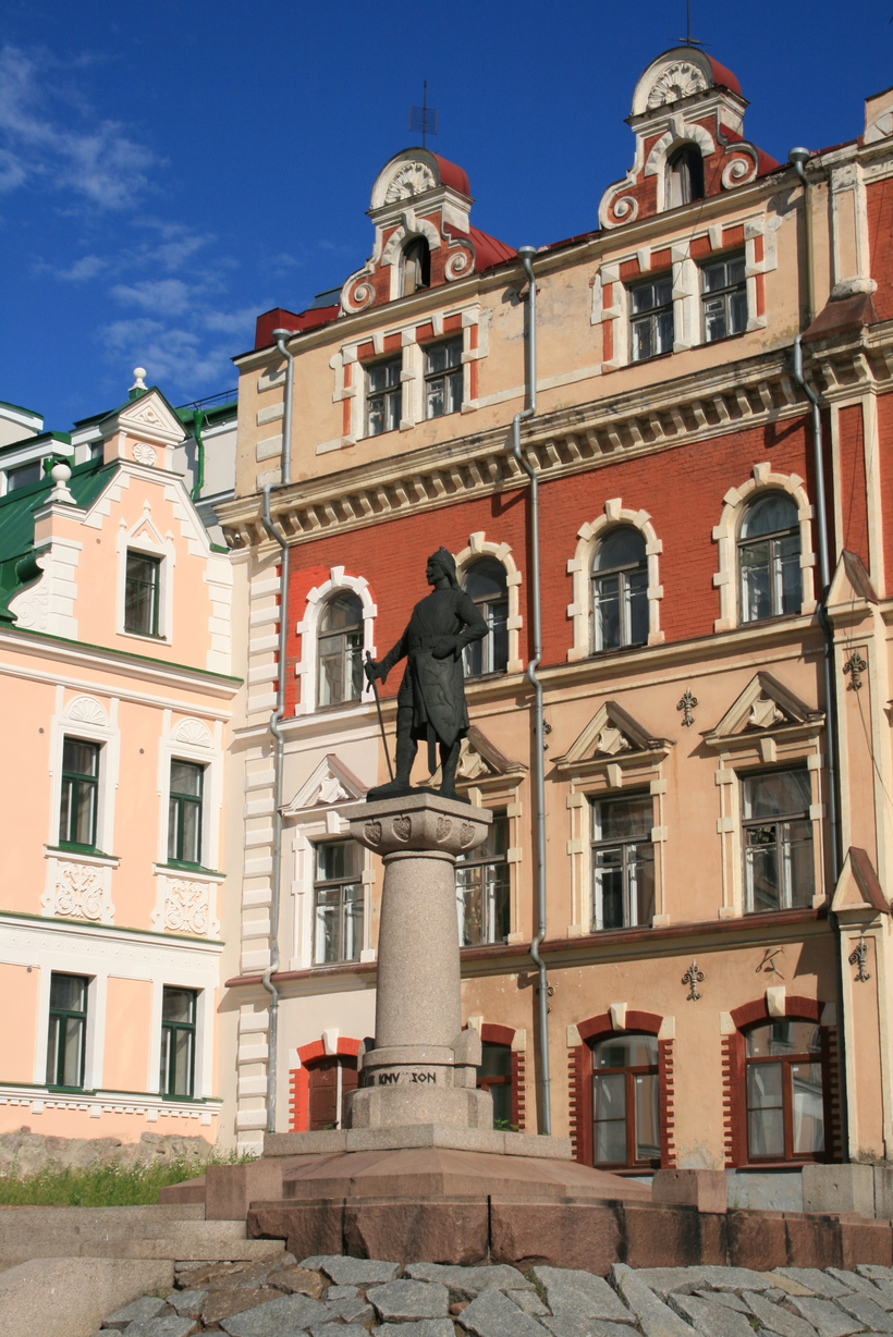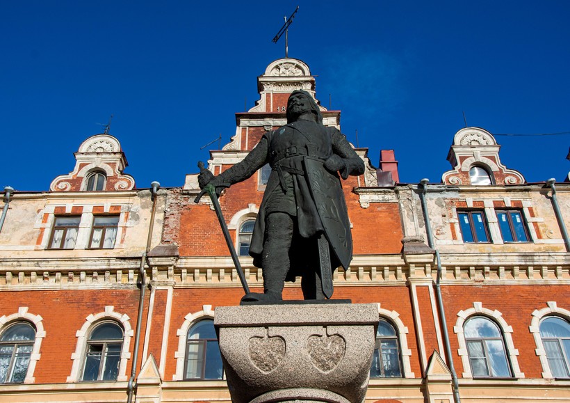 Бывший хозяин Выборга Торгильс Кнутссон, маршал Швеции, он же основатель и строитель Выборга, руководитель Швеции на время малолетства детей короля. Он очень многое сделал для Выборга, как укрепленной цитадели на завоеванной земле, был талантливым и незаурядным военачальником и градоначальником. Интересно, что памятники и взгляды Кнутссона и Петра Первого Великого точно противопоставлены против друг друга. :) Казалось, показывают, мол, кто же возьмет верх?