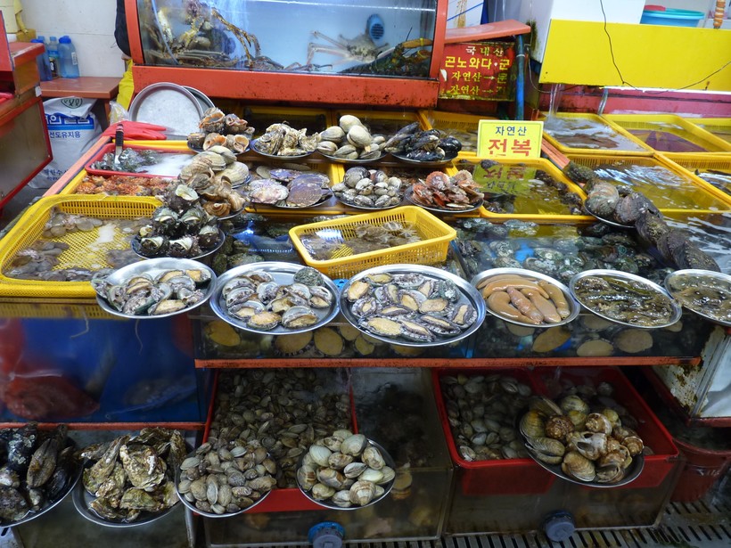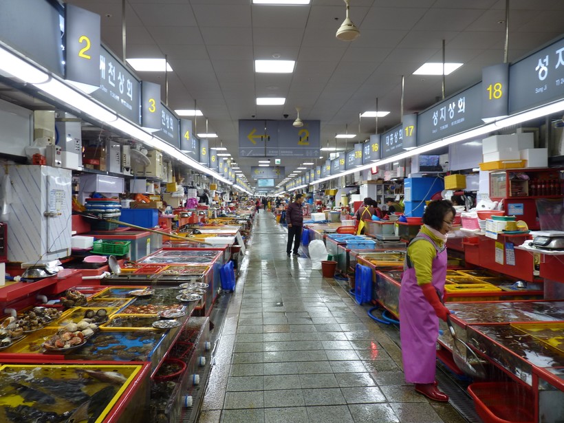 - Рыбный рынок Пусана. Это один из самых хороших рыбных рынков - наверное в мире! Тут можно купить всё, что водится в море, даже тунца или камчатского краба, которых и в помине нет у побережья Кореи. Корейцы едят сырых морепродуктов, гораздо больше - даже чем японцы. Национальное блюдо "Хё", из сырой рыбы в острой заправке, аналоги "сашими" и бог еще знает сколько вариаций на эту тему - всё это можно тут купить и попробовать. Рыбный рынок Пусана - очень хорош, обязателен к посещению.