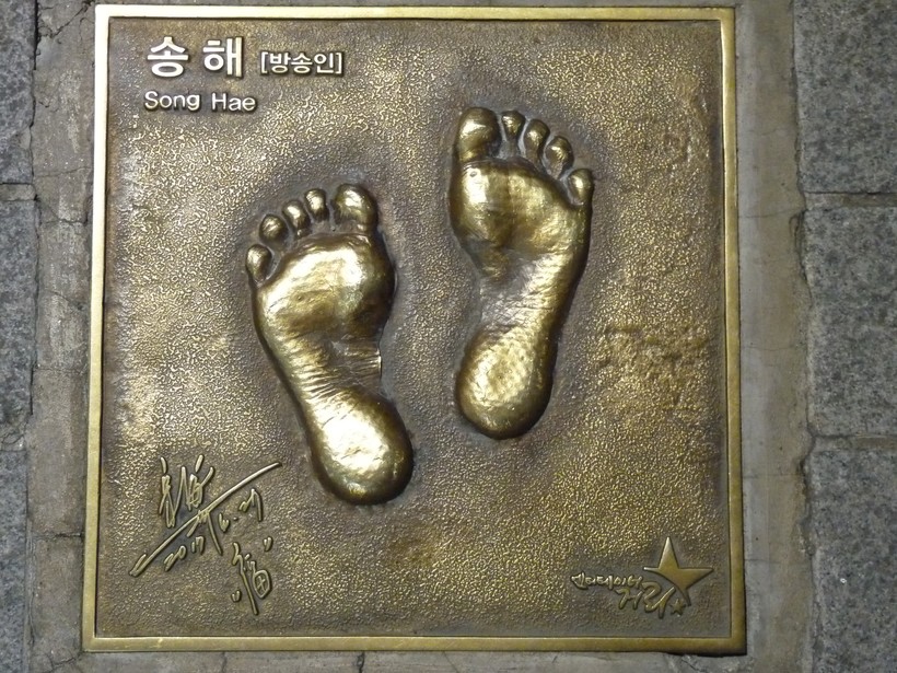 Хотели уже ехать домой, но заметили указатель на парк Yeongdusan. Оказалось, это буквально 1 квартал за поворотом. По дороге к парку интересная аллея звезд с отпечатками не рук, а стоп )