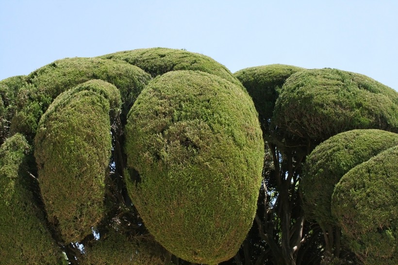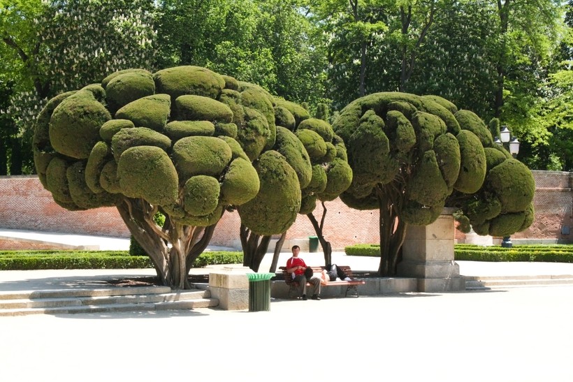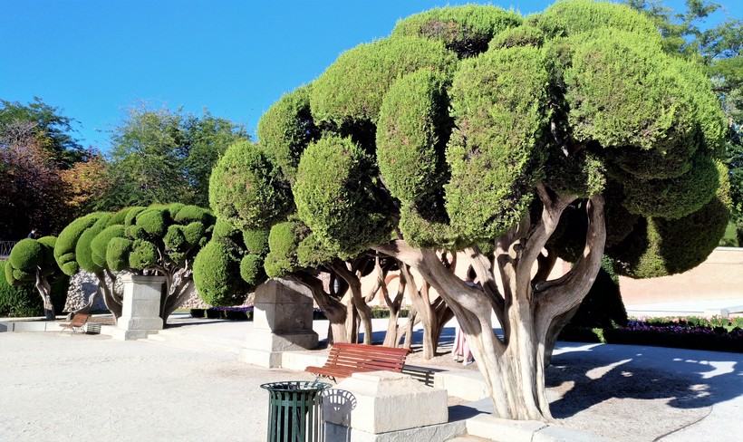 Оказалось, что это подстриженные особым образом земляничные деревья. Такое дерево красуется на гербе Мадрида, а прилагается к нему прислонившийся к стволу медведь. Но на гербе оно нестриженое, а тут вот...