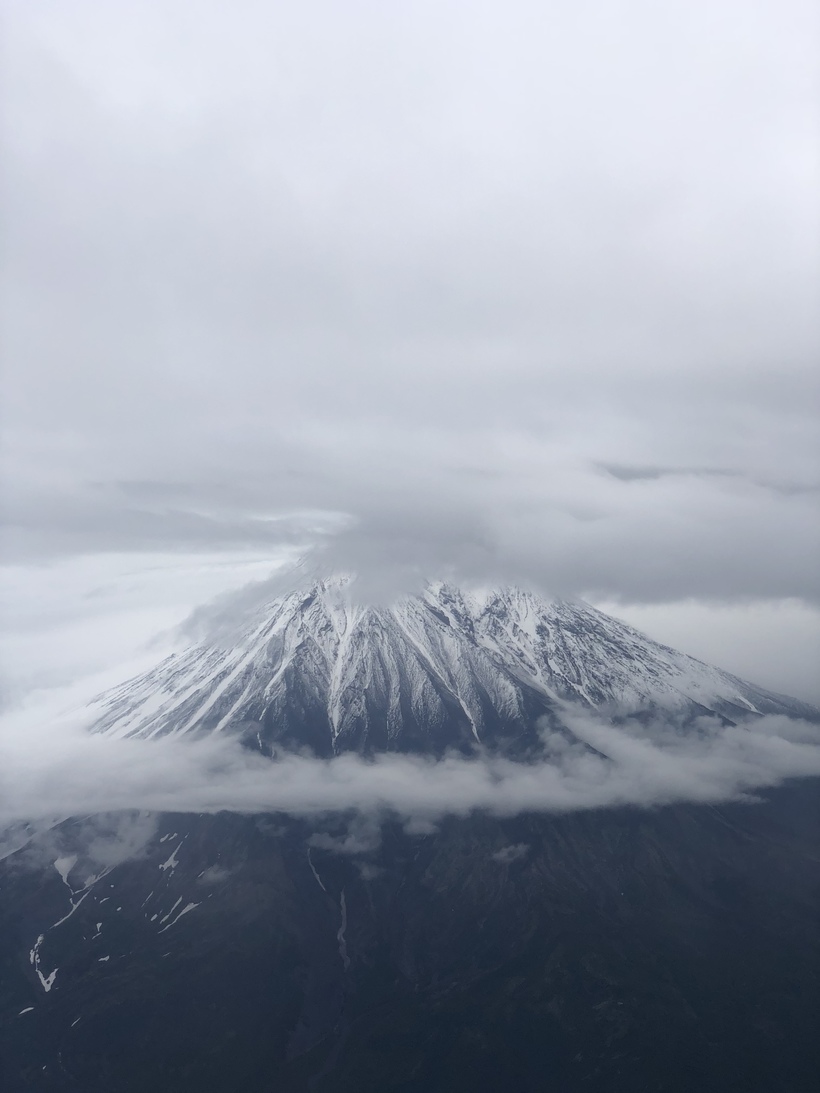 Выходя из самолета, я обернулся назад, чтобы сфотографировать потрясающий вид - самолёт на фоне вулкана, верхушка которого запорошена снегом.