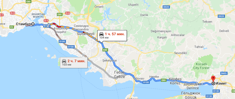 Расстояние между Стамбулом и Измитом составляет 83 километра или 52 мили по прямой и 101 километр или 63 мили по автодорогам.