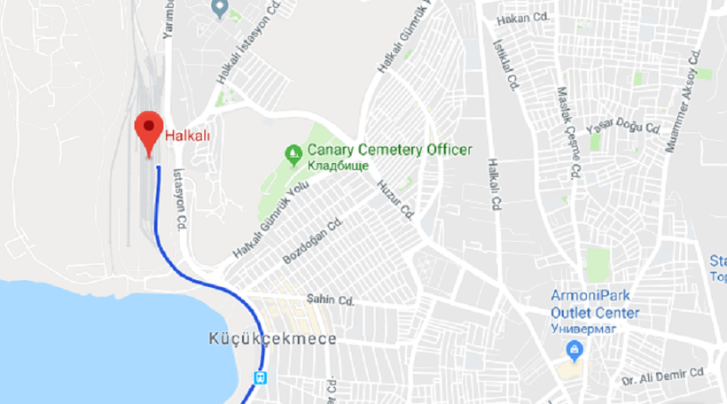 Отправляются поезда от ж/д станции Halkali, расположенной в одноименном районе европейской части Стамбула на улице Yarımburgaz Mahallesi, в: