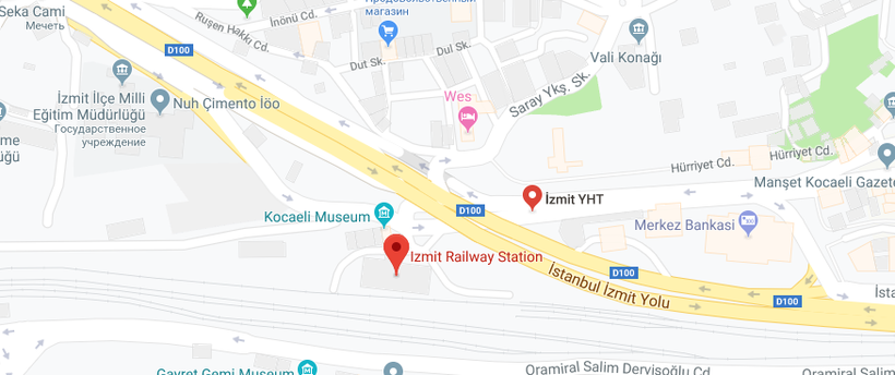 Расстояние между Стамбулом и Измитом поезда преодолевают всего за 2 чача 8 минут, прибывают они в Измит на ж/д станцию на улицу Kozluk Mahallesi, это недалеко от центра города.