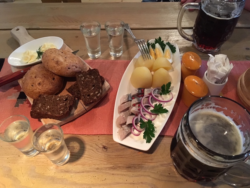· На Ратушной площади есть открытые кафе, но стоит зайти внутрь Ратуши, в знаменитую харчевню-трактир «III Draakon». Мне очень понравились пирожки, лососевая похлёбка и огурцы, которые я лично наловила себе из кадки.