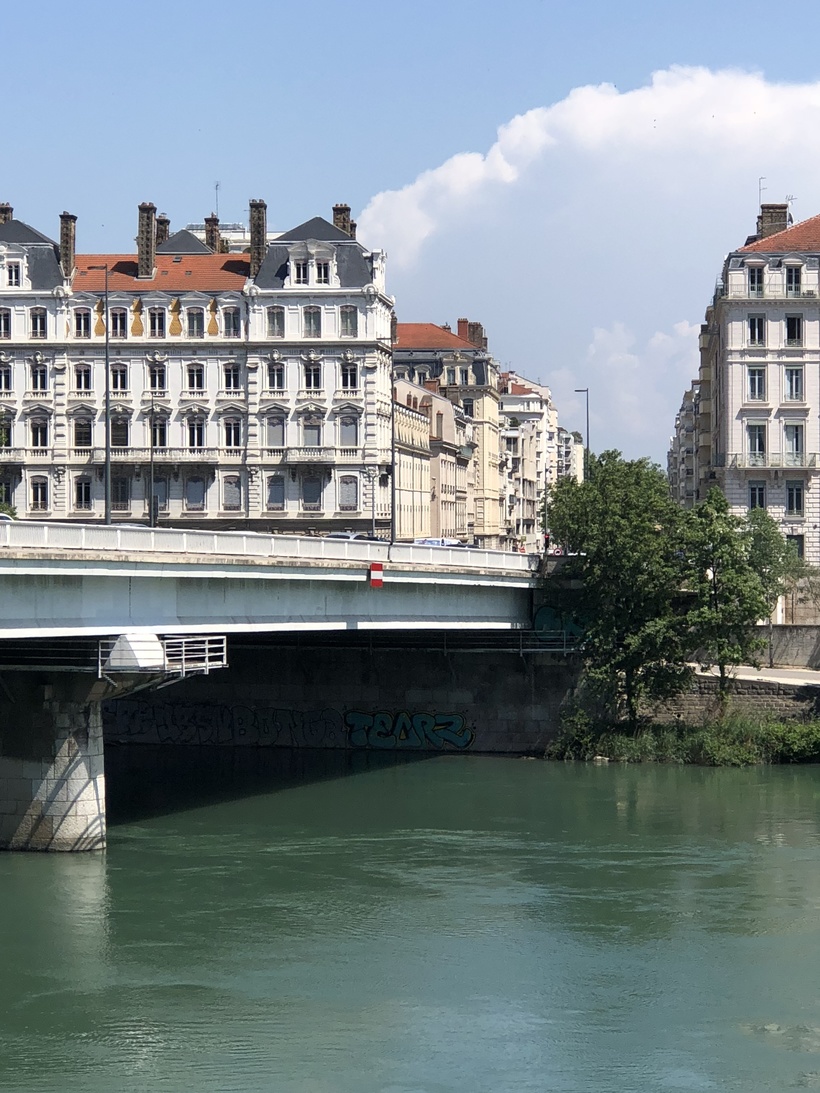 Хочется отметить, что благоустроенные берега протянулись от начала города до самого конца. Мы видели и отдыхающие парочки, и граффити, и велосипедистов, и бегунов от инфаркта. В этом плане Лион, смотрящийся с реки, очень живописен.