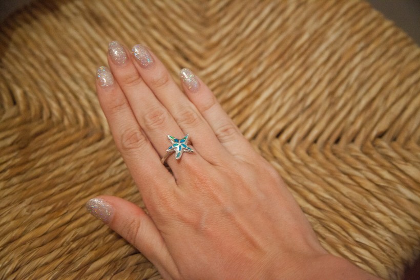 Витрины магазинов манят, и пройти мимо просто невозможно. Что брать? Керамику, мыло, уже упомянутые губки и пемзу... А вот оливки и прочие масла спокойно можно купить в любом супермаркете. Еще, девушки, рекомендую обратить внимание на украшения с ярким голубым камнем, который интригующе переливается. Это голубой опал. Обычно оправляют его в серебро, он лучше всего смотрится именно в этом металле. У меня несколько критских украшений с ним, и одному комплекту в этом году уже 10 лет исполнится. Все с ним в норме, ничего не поломалось и не потемнело, хотя ношу я его интенсивно. А в предпоследний свой визит на Крит я купила колечко.