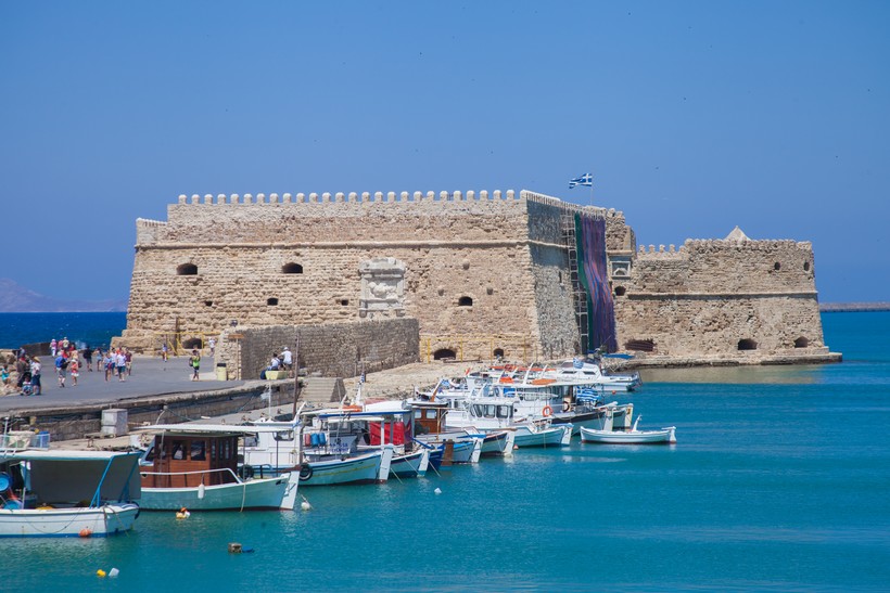 Порт ираклионцам удался, иначе и не скажешь. Тут живописно устроилась крепость, как бы защищающая вход в марину. На деле история у этого сооружения долгая, сложная, с захватами и обрушениями; не сразу оно тут появилось, и не сразу стало, собственно, защищать. Пересказывать вам эту историю я не буду, сохраним интригу. Вся эта информация изложена на стендах рядом с крепостью и внутри.