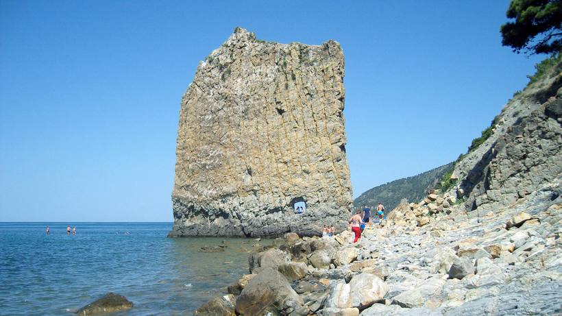 Вокруг скалы раскинулись живописные горы и чистейшее лазурное море – погулять тут и искупаться очень приятно.