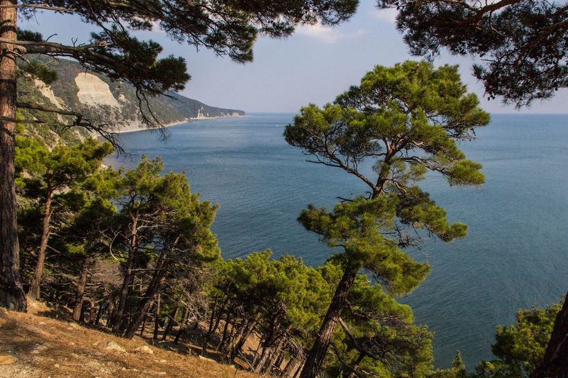 Местность тут скалистая, на склонах растут сосны. Как потом оказалось, это какие-то реликтовые растения, древние пицундские сосны. Они и на самом деле необыкновенные, высокие, красивые, статные. А со скал открывается необыкновенный вид на море и окрестности. Любоваться видами можно бесконечно.