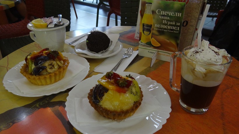 - Цены ниже, чем на курортах. И это в и без того недорогой Болгарии. Я не беру возможность пообедать в ресторанном дворике в ТЦ, но даже 3 пирожных, чай и ирландский кофе (тот, в который добавляется виски) обошлись нам в небольшой кафешке на одной из центральных улиц в 10,6 лева.