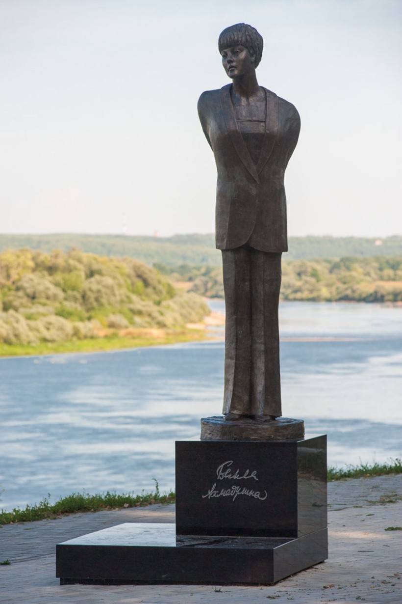 Чуть поодаль установили памятник Белле Ахмадулиной. Автор - муж поэтессы изобразил её в полный рост с заведенными за спину руками. Так она часто зачитывала свои стихи.