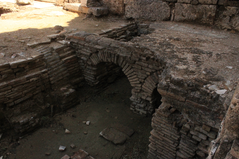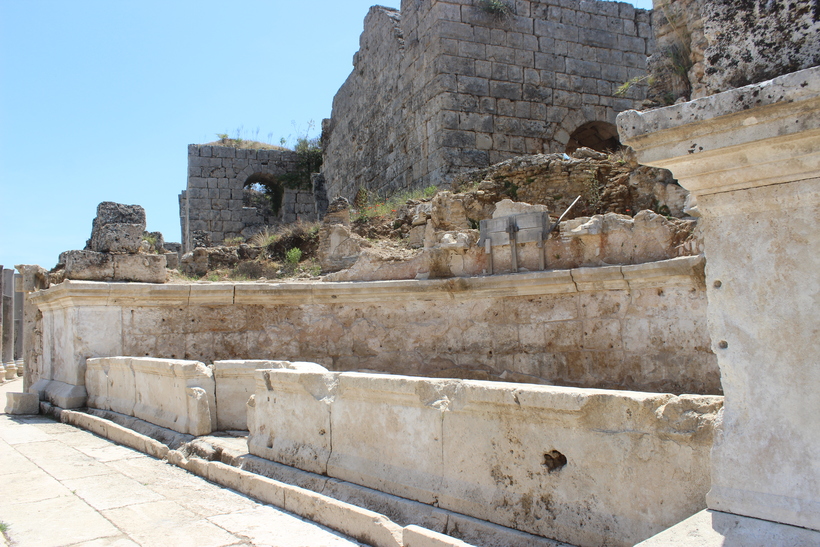 Слева от той же колоннадной улицы тянутся термы, причем достаточно большие. Термы или римские бани всегда свидетельствовали о богатстве или бедности города. Термы в Перге когда-то были отделаны роскошным камнем и мрамором, а на полу красовалась мозаика. Они были не только банями, но и местом встреч или полноценного отдыха после трудовой недели. Пройдя во внутрь обратите внимание на систему, подогревавшую полы. Присмотритесь и вы увидите останки от печей, в которых когда-то кипятилась вода. Потом она подавалась по желобам, расположенным прям под половой и стенной плиткой.