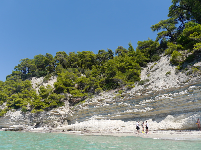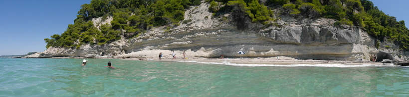 Пляжи не очень широкие, иногда чтобы попасть на следующий пляж необходимо обходить по морю выступы песчаника – камня из которого сделаны почти все постройки на Кассандре, и он предстает перед нами в виде крутых отвесных скал. Если говорить о том песчаные или галечные пляжи, ответ такой – они разные. Здесь галька, а пройдешь 500 метров и взору откроется прекрасная песчаная бухточка. Мы всегда были в пути в поисках разных бухточек и интересных пляжей.