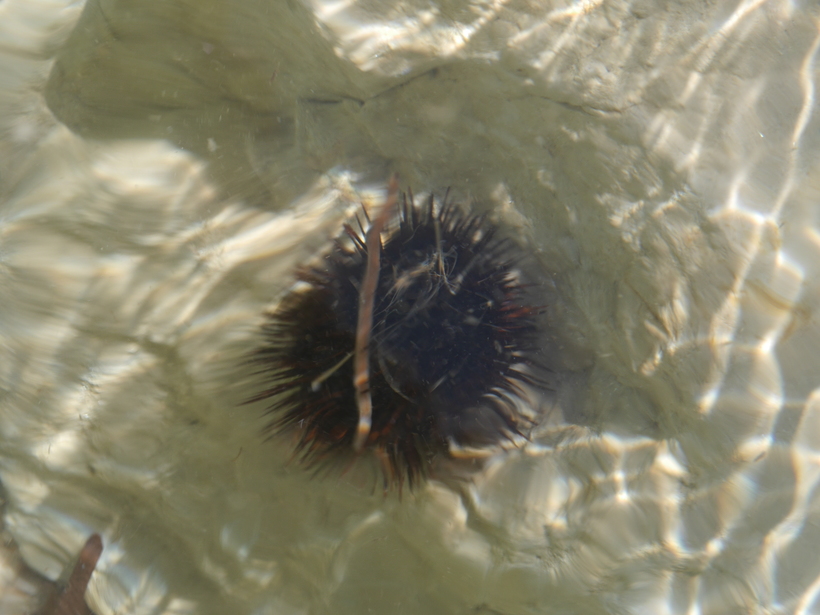 • В море на песчаниках живут морские ежи! Милые колючие шарики с очень острыми иголками. Купаясь на диком пляже в первый же день, муж прекрасно познакомился с этими очаровательными созданиями. Потом три часа я вытаскивала ему очень тонкие, но очень прочные иголки, которые благополучно разместились на его ступне в очень большом количестве. Так что будьте внимательны, даже не на диком пляже их можно встретить на камнях-песчаниках. Нам повезло, что они не ядовитые.