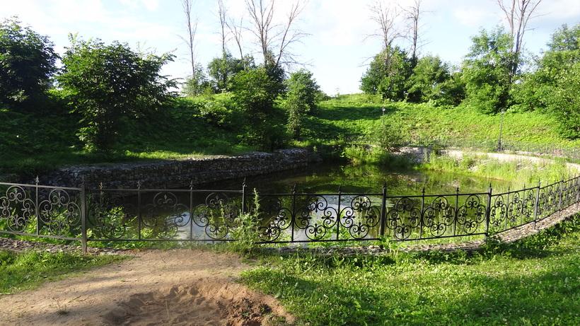 - Можайский кремль. По факту, это зеленая зона — в меру дикая, в меру ухоженная и очень немноголюдная. Там есть и глухие заросли борщевика, и аккуратные, вымощенные свеженькой брусчаткой дорожки. А еще с кремлевского холма открывается весьма необычный вид на скопление деревянных домиков в натуральном овраге. Крайне органично вписывается в пейзаж современная деревянная часовня. Из исторических построек там имеется еще Петропавловский собор, также известный, как Старо-Никольский, но хотя он и построен в XIX веке, с Ново-Никольским не идет ни в какое сравнение.