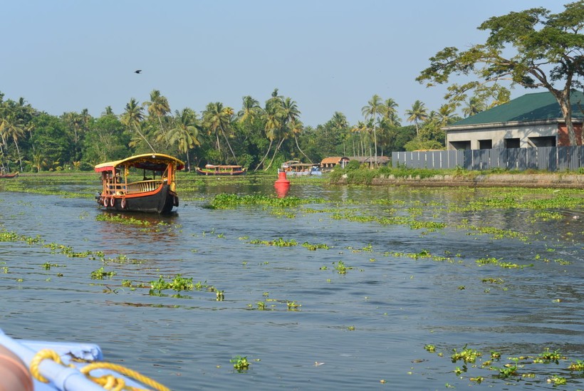 Мы оказались в городе Алапуджа. Тут сплошные каналы, озёра и реки, так и вспомнилась песня: «вода, вода…кругом вода…». А так как много воды – огромное количество зарослей, минус, что никто этим не занимается. Такой травяной паразит, как гиацинты, даже убивают рыбу, она просто там запутывается и гибнет, и это потом неприятно пахнет. Мы проехались на водной маршрутке за 0,92 $ с человека.