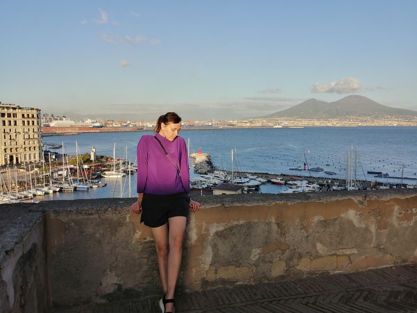 (согласно легенде Виргилия - замок яйца) похож на город-корабль, севший на мель. Вход на крепость бесплатный, рукотворных шедевров мы здесь почти не застали, но были приятно удивлены серпантином террас, с которых открываются очень волнительные виды на море, город и конечно Везувий. Чайки тут и там летают над водой, а затем неожиданно садятся на парапет и попрошайничают вкусняшки. Успели накормить хрустящим багетом несколько особей: я была в шоке когда заметила как у них текут слюнки из клювика и решительно не могла отказать.