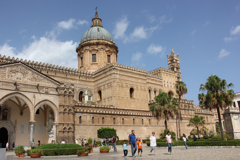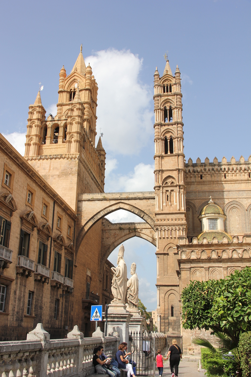 А мы идем дальше, ведь впереди у нас одна из главных жемчужин Палермо – Кафедральный собор Успения Пресвятой Богородицы. Когда смотришь на него, кажется, что он построен из песка и увенчан глазированным куполом. Как будто вылепленные красивые башенки, лопаточкой отполированные стены, деревянной палочкой начерчен причудливый узор.