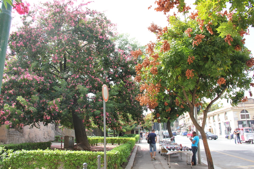 Если Вы как и мы, будете гулять по Палермо в жаркий день, то от полуденного зноя спасают многочисленные парки. Рядом со Дворцом расположен Парк Villa Bonanno. Там прохладно благодаря пальмовому саду и очень красиво. Деревья на Сицилии цветут практически круглый год.