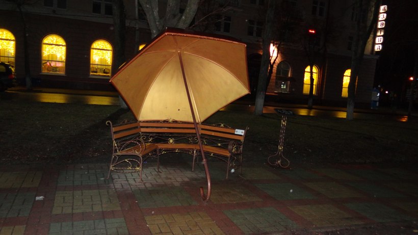 - Памятники архитектуры. А они в Полоцке очень разные. Тут и розовая пожарная каланча раннесоветского периода, и лютеранская кирха, в которой сегодня тоже музей, и водонапорная башня, и военный мемориал на площади Свободы, и обязательный памятник Ленину. Помимо этого, есть в Полоцке и просто дома, которым явно более 100 лет, и, конечно же, церкви. Кстати, в Полоцке я видел весьма занятный объект — лавочка, над которой установлен искусственный зонт. Нечто похожее я видел позже на автобусной остановке в российском городе Вязьма.