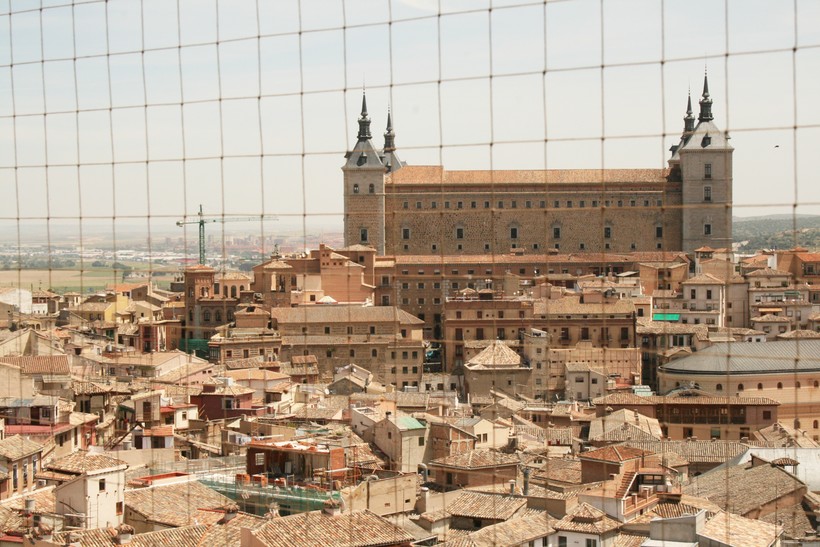 В башне тоже никого, кроме голубей, не оказалось. Голуби ворковали, запуская по кругу очередной сезон брачных игр, и не туристок не обращали никакого внимания. Открывался дивный вид на черепичные крыши Толедо, правда, немного подпорченный сеткой, видимо, поставленной, чтобы туристы не повыпадали. Ну, или чтобы голуби не залетали (второе уж скорее).
