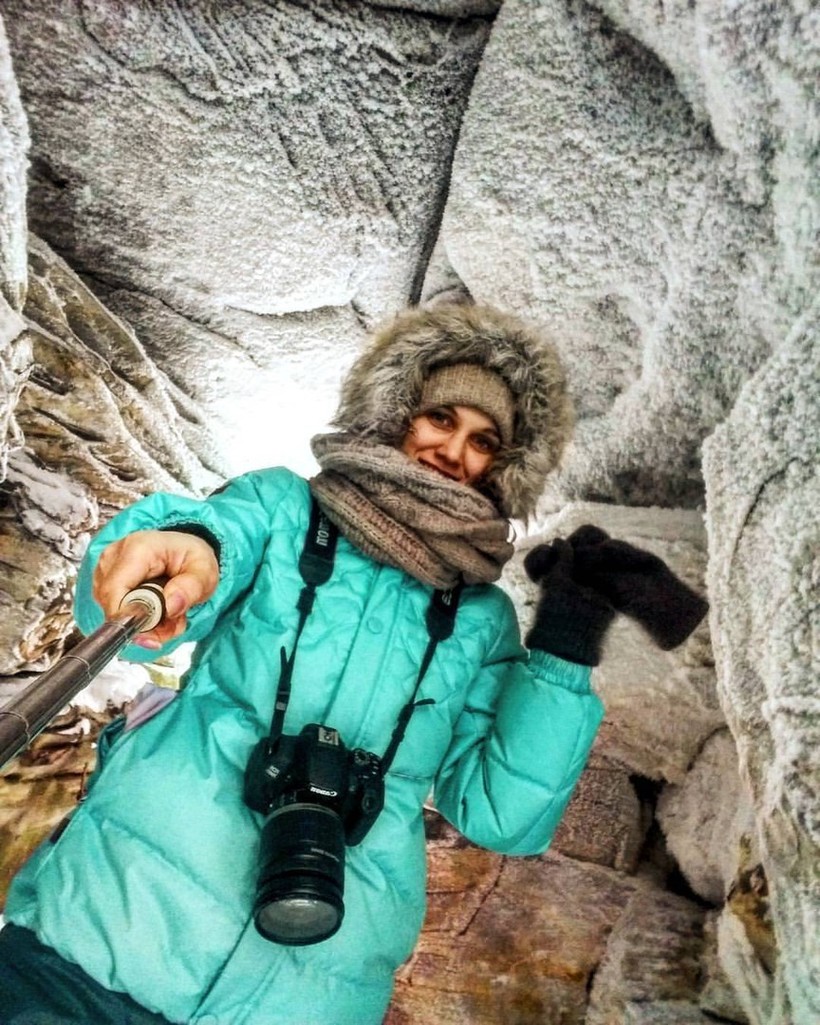Из всего вышеперечисленного самым интересным для меня оказался Каменный город. До сих пор это яркие впечатления, как самая холодная и самая снежная прогулка за всю мою жизнь! Температура -32 градуса, а мы ушли вглубь тайги на 2 часа. Если бы не теплая горнолыжная одежда и валенки, я бы точно не выдержала. К слову, девушка из группы убежала обратно в автобус со слезами на глазах спустя 20 минут прогулки, так как одета была просто в джинсы и легкие сапожки, да еще и шапку посчитала “не модной” в такую температуру. Отогревалась она долго и с болью.