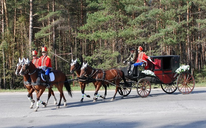Вот такие кони с каретой были у нас в Новосибирске. Содержали их в конюшне на заводе у Проничева. Отличная конюшня. Коней покупали на первом московском конном заводе. Директор там Прохоров. Карета с киностудии Амедиа. Снималась в фильме "Адъютанты любви". Схаживали долгое время коней, что бы они могли в четверике ходить. По Новосибирску ездили. Но оказалось очень мало востребованным. Даже на свадьбы с большей охотой брали лимузины.