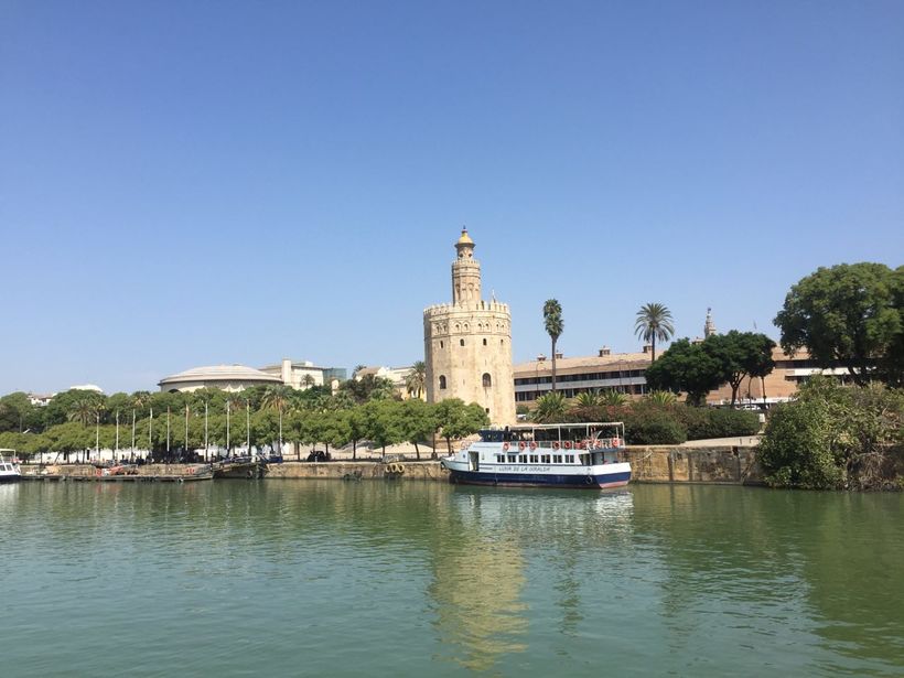 И, пожалуй, площадь Испании я бы назвала самым красивым местом Севильи. Если вы располагаете временем, советую обязательно задержаться здесь подольше и прогуляться по парку вокруг. Нас же из кареты по нашей же просьбе высадили у Золотой башни. Золотая она отнюдь не из-за цвета, а потому что в ней хранили золото, привезенное из Америки. И прямо там с кареты мы пересели на кораблик и катались по реке Гвадалквивир. Кораблик ходит довольно часто, отправляется как раз от золотой башни, на борту как оно обычно и бывает - экскурсия.