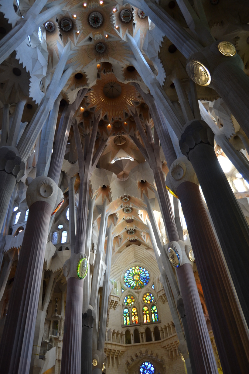 Саграда Фамилия - это конечно впечатление на всю жизнь. Зайдя внутрь, ты просто не можешь отвести взгляд от всего этого великолепия. Вокруг тебя окружает что-то невероятное. Внутренние опоры в виде деревьев, витражные окна, распятие Христа весит в воздухе...