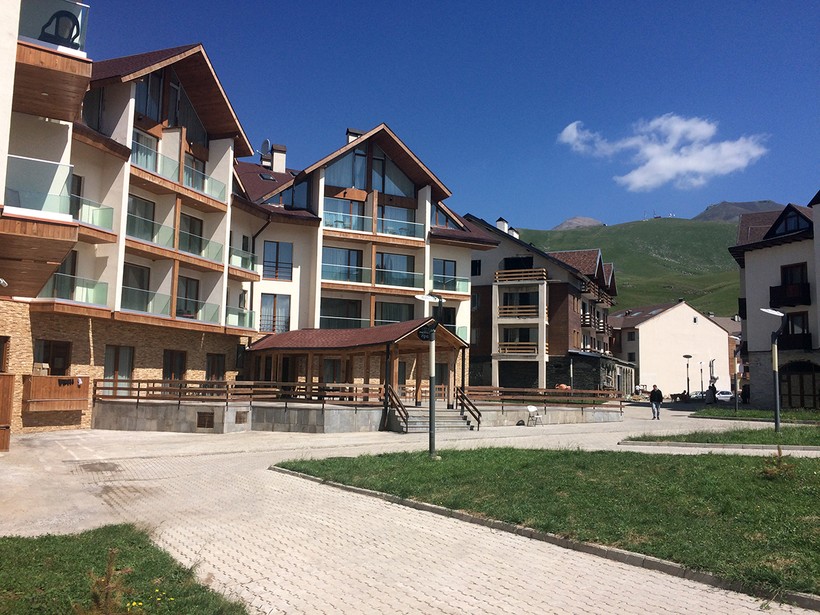 Территориально все жилье в Гудаури можно разделить на несколько зон – нижний, центральный, верхний и новый Гудаури. Я поселилась в уютных апартаментах с собственной кухней в Новом Гудаури, буквально в двух минутах ходьбы от подъёмника на Пик Садзели. Цена на апартаменты летом здесь начинается от 1700-2000 рублей за сутки. Район находится немного в стороне от основной туристической зоны, но если вы на машине, это не проблема. Тем более, оттуда открываются красивые виды на окрестности.
