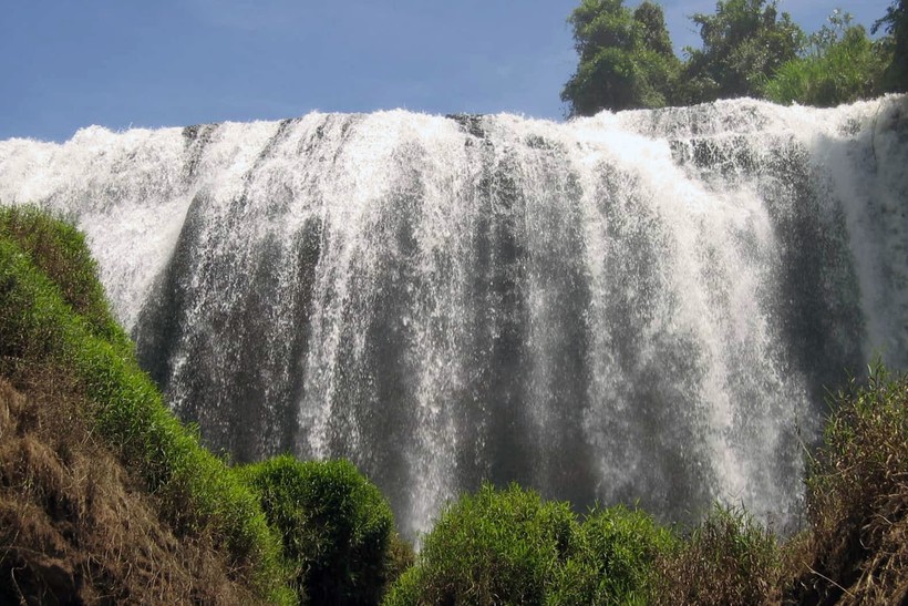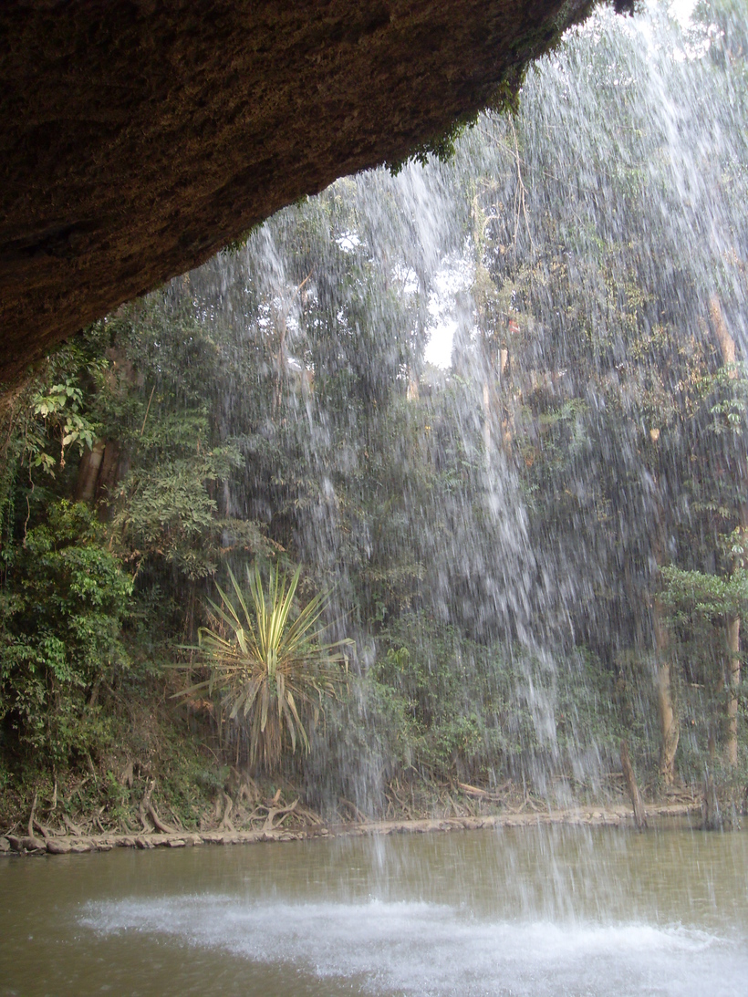 Слоновий водопад гораздо менее популярный, но более мощный с сильными потоками воды. К водопаду ведет довольно крутой спуск. Мне очень понравилось, что тут через пещеру можно пройти прямо под водопад.