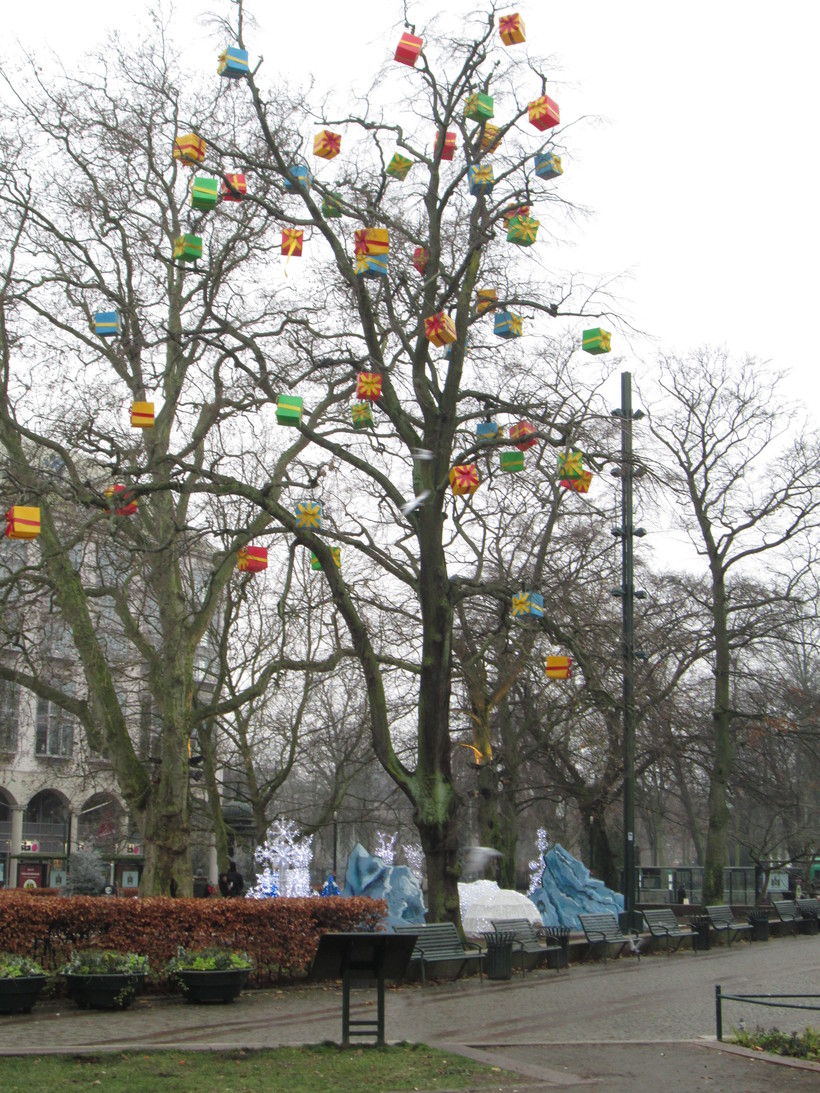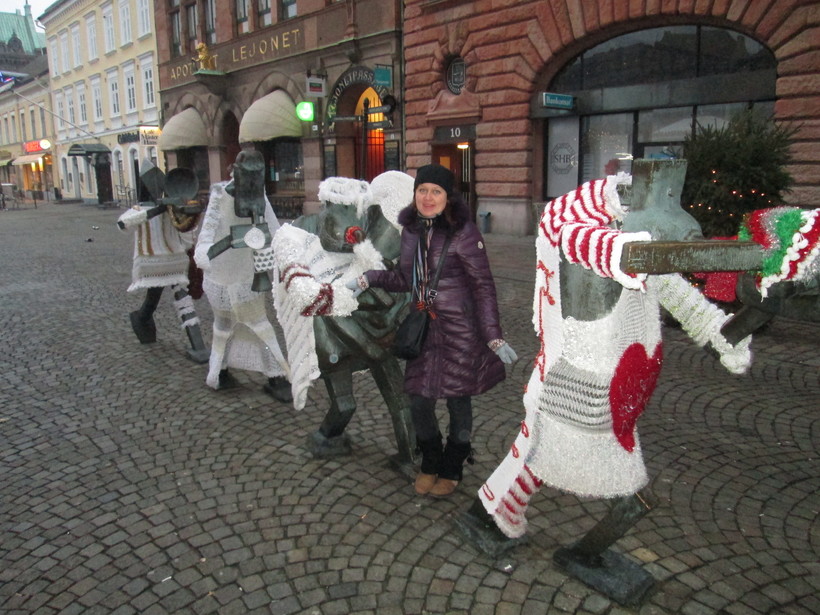 Отсюда ноги сами несут нас на улочку Седергатен, где находится всемирно известная скульптурная композиция – уличный оркестр (он здесь часто выступал в средние века). Сегодня музыкантов одевают в различные костюмы, и потому мы тоже не могли не сфотографироваться с известными ребятами в новогодних, видимо, костюмах.