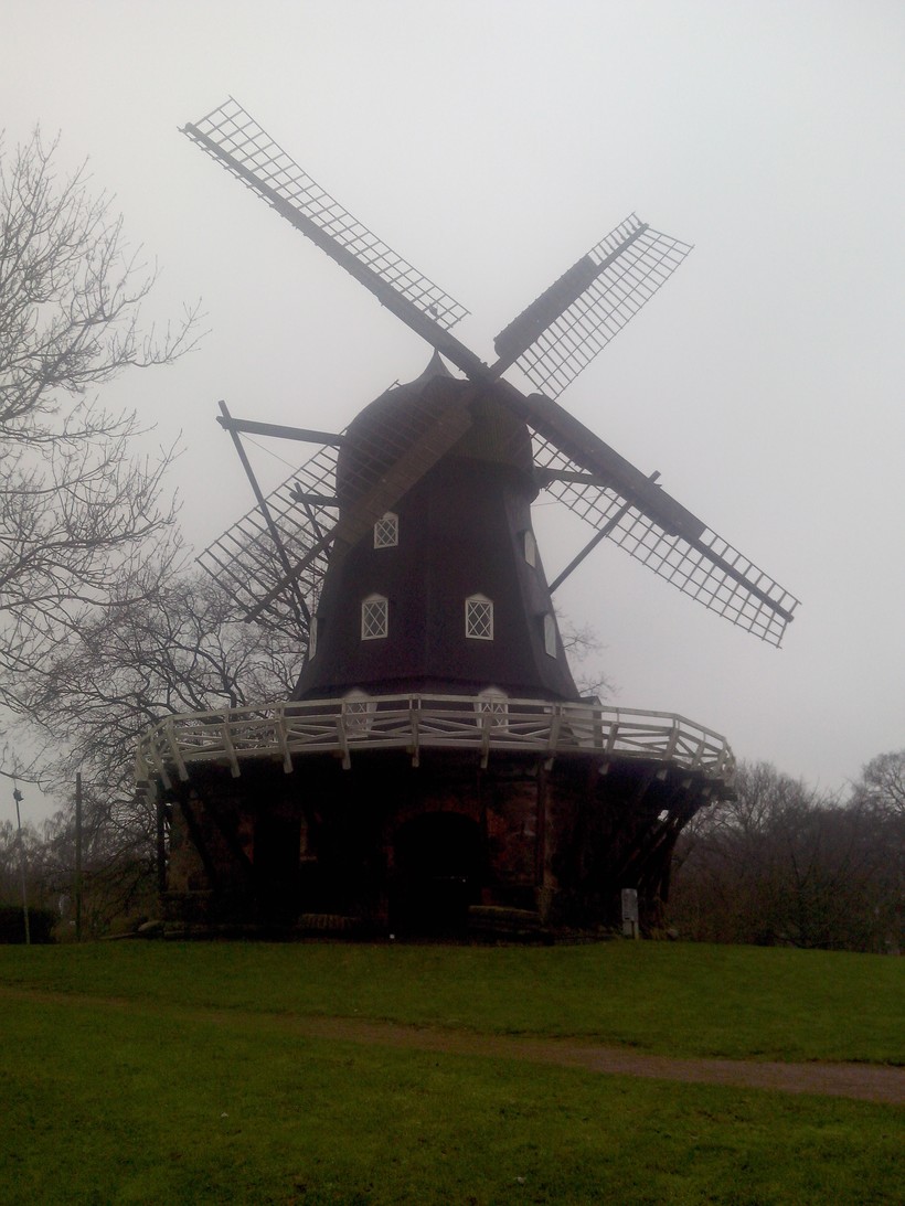 В парке много прудов, дорожек, и летом, наверное, довольно бурная растительность. Здесь мы встретили голландскую мельницу.