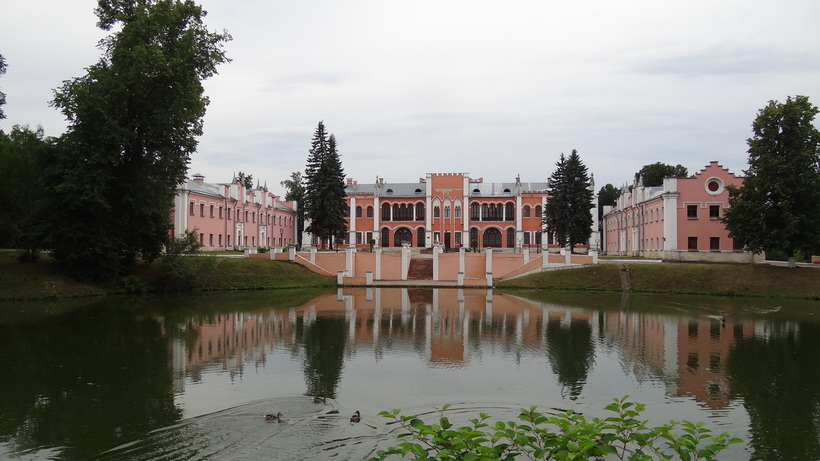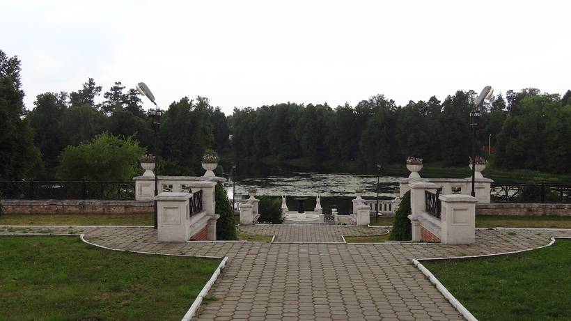 - Главный дом с флигелями. Ядро усадьбы вызывает невольные ассоциации с европейскими романтическими дворцами, подражающими средневековой архитектуре. Главный дом — неплохо отреставрированное снаружи красно-белое неоготическое здание с башенками и стрельчатыми окнами. Флигели выглядят не столь эффектно. Их задача — дополнять дворцовый ансамбль. Рядом находятся два фонтана. Тот, что расположен между флигелями, выглядит достаточно аскетично, но во время моего приезда он действовал. Другой фасад основного здания смотрит в сторону Нижнего Большого Марфинского пруда. К пруду от дворца ведет лестница, на конце которой есть еще один фонтан, куда более изящный, но он не работал. У самого берега установлены величественные скульптуры грифонов, смотрящих вдаль.